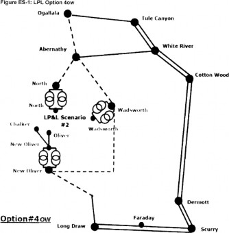 ERCOT’s response to PUCT Project Number 45633 demonstrated that transmission solution ‘4ow’ not only addressed LP&L’s request to interconnect with ERCOT, but it also addressed the long-term plan to “increase the export capacity from the Panhandle” generation resources.3 Sharyland’s transmission assets in the panhandle, that were built during the Competitive Renewable Energy Zones (CREZ) program, provided two northern, 345kV interconnection points (Ogallala and Abernathy stations). Sharyland also had a southern point of interconnection that tied to the West Texas oilfield load which was relatively close to the southern connection point for LP&L. ERCOT’s map of 4ow is shown below in Image #1.